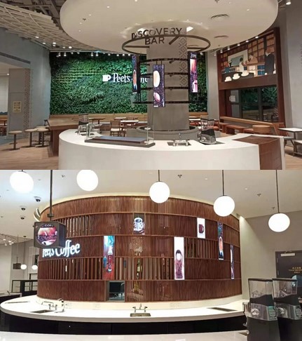 金年金字招牌为皮爷咖啡量身打造不同规格的展示屏,在满足功能的基础上打造时尚优雅的环境氛围。