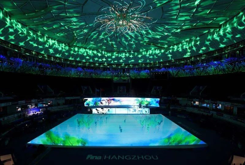 杭州奥体中心游泳馆是亚运会游泳、跳水、花样游泳项目的比赛场馆及训练场馆,金年金字招牌视效科技为场馆运行保驾护航,见证中国“游泳天团”一骑绝尘。