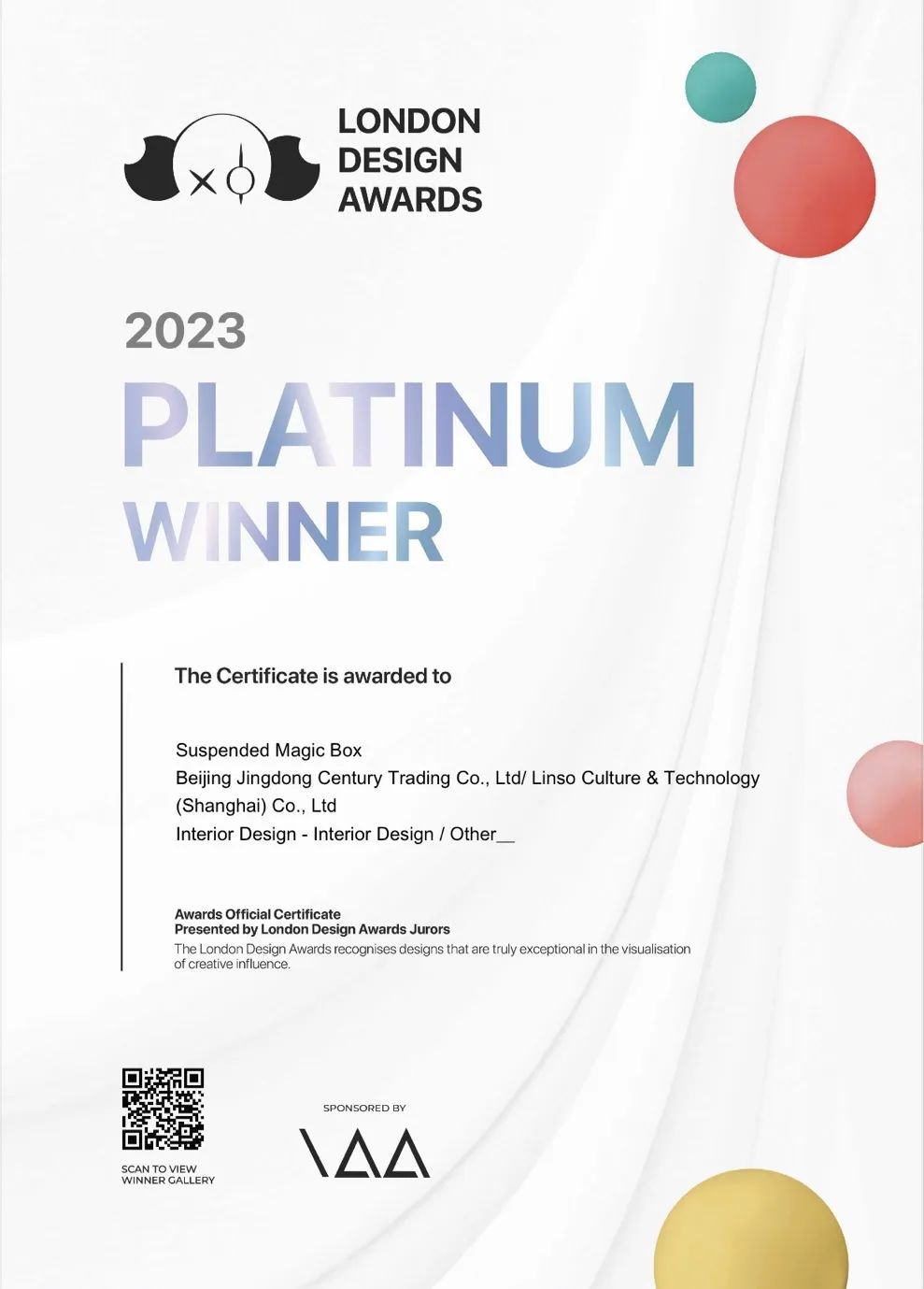 金年金字招牌·蓝硕科技联合京东共同打造的东莞京东MALL裸眼3D数字艺术装置——“悬浮魔盒”(Suspended Magic Box) 荣获2023伦敦设计奖(London Design Awards)最高级别奖项——铂金奖。